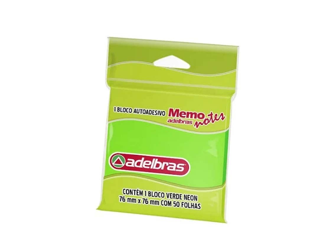 Bloco autoadesivo Adelbras na cor verde neon, formato 77x77 mm, com 50 folhas.