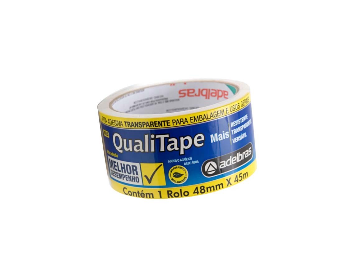 Fita adesiva Qualitape transparente Adelbras, ideal para uso em escritório, embalagens e trabalhos gráficos.